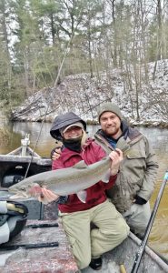 Formally known as J&J River Guides Inc, the business was bought and reestablished as Northern Rivers Outfitters by Kameron and Monica Zemites in 2025. Kameron has been guiding since 2013, actually starting out for J&J River Guides so this is very special and sentimental to be taking over the business formally. Kameron has been guiding the Northern and West Michigan rivers since 2013 and also has been guiding in King Salmon, AK since 2017. Monica and Kameron live in Bitely, MI and are both active outdoor enthusiasts! The couple enjoys every minute of fishing and hunting time they get. They were just married in July 2025 up at Katmai National Park, AK- and of course got married, and then immediately went fishing for the remainder of their wedding day!